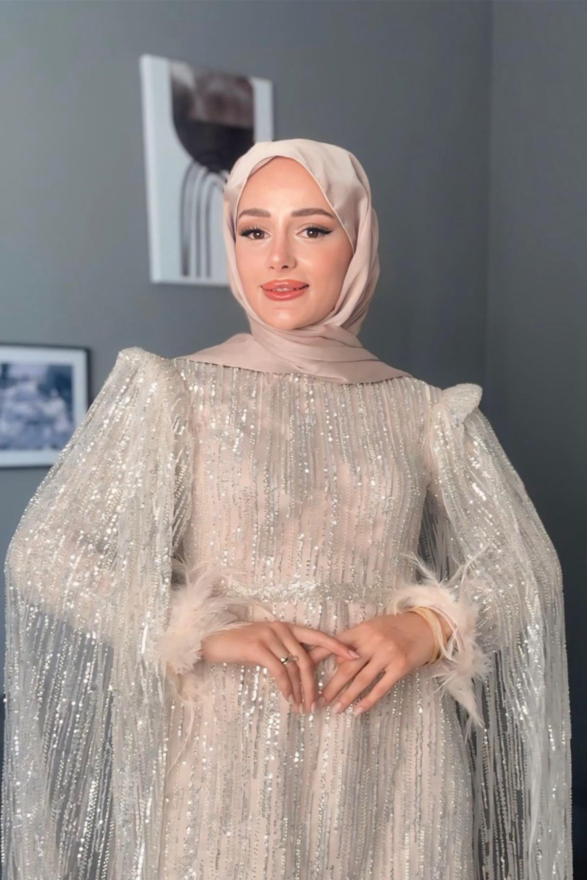 Zarafetin ve Asaletin Buluştuğu An: Bej Pelerinli Tüylü Abiye