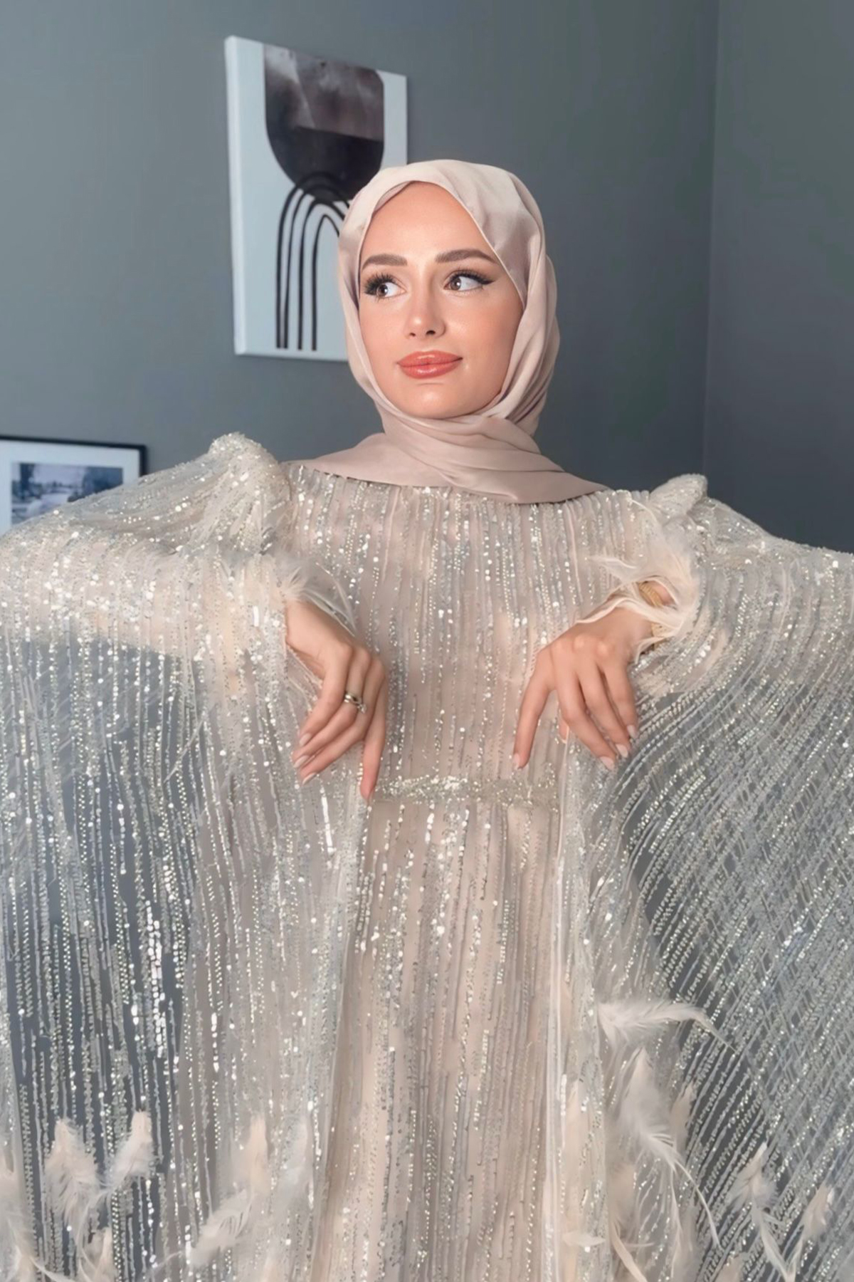 Şıklığın sınırlarını zorlayan bu bej pelerinli tüylü abiye, göz alıcı tasarımıyla davetlerin yıldızı olmanız için özel olarak tasarlandı. Yumuşak bej tonuyla teninize doğal bir ışıltı katarken, omuzlardan zarifçe dökülen pelerin detayı asil bir duruş kazandırır. Göğüs ve kol bölgesini süsleyen ince tüylü işlemeler ise tasarıma romantik bir dokunuş ekler.