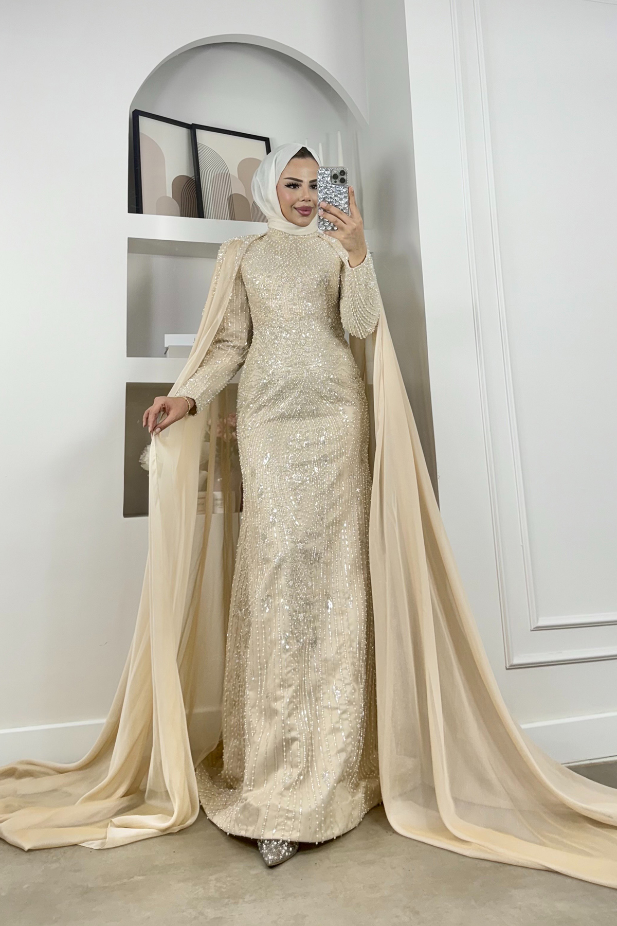 Özellikle nişan, düğün, mezuniyet ve özel davetler gibi anlarda dikkat çekici ama ölçülü bir görünüm elde etmek isteyenler için ideal bir tasarımdır. Tesettür giyime uygun yapısı, sadeliği ve ihtişamı dengeler.
