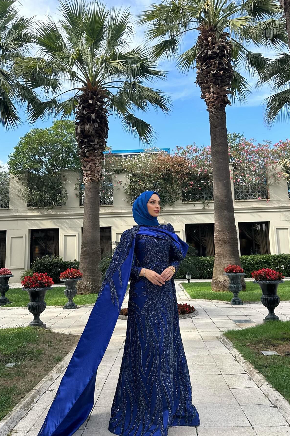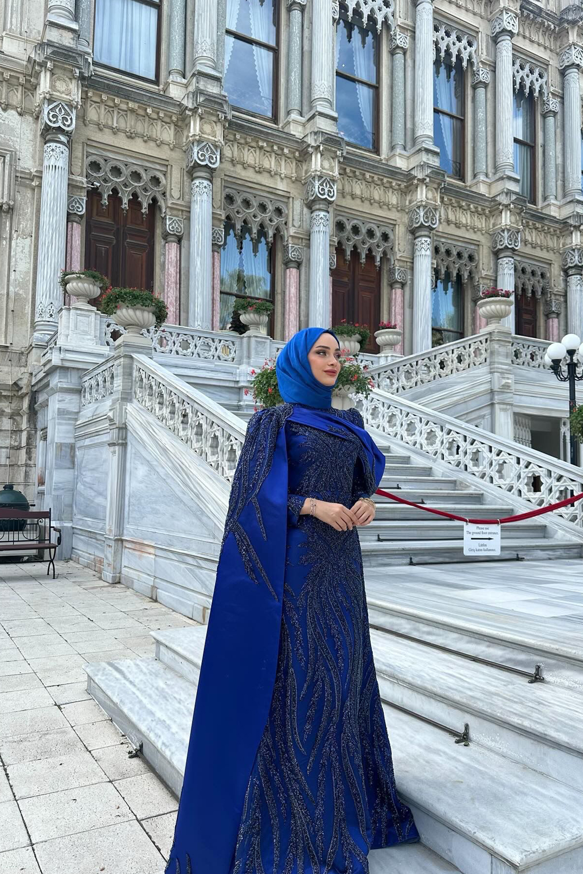 Saks mavisi abiye, hem yaz hem kış sezonu için uygundur. Minimal takılar ve şık bir topuklu ayakkabı ile kombinleyerek göz alıcı bir stil oluşturabilirsiniz. Gardırobunuzun vazgeçilmez parçalarından biri olacak bu pelerinli abiye elbise ile her ortamda stilinizi konuşturun.